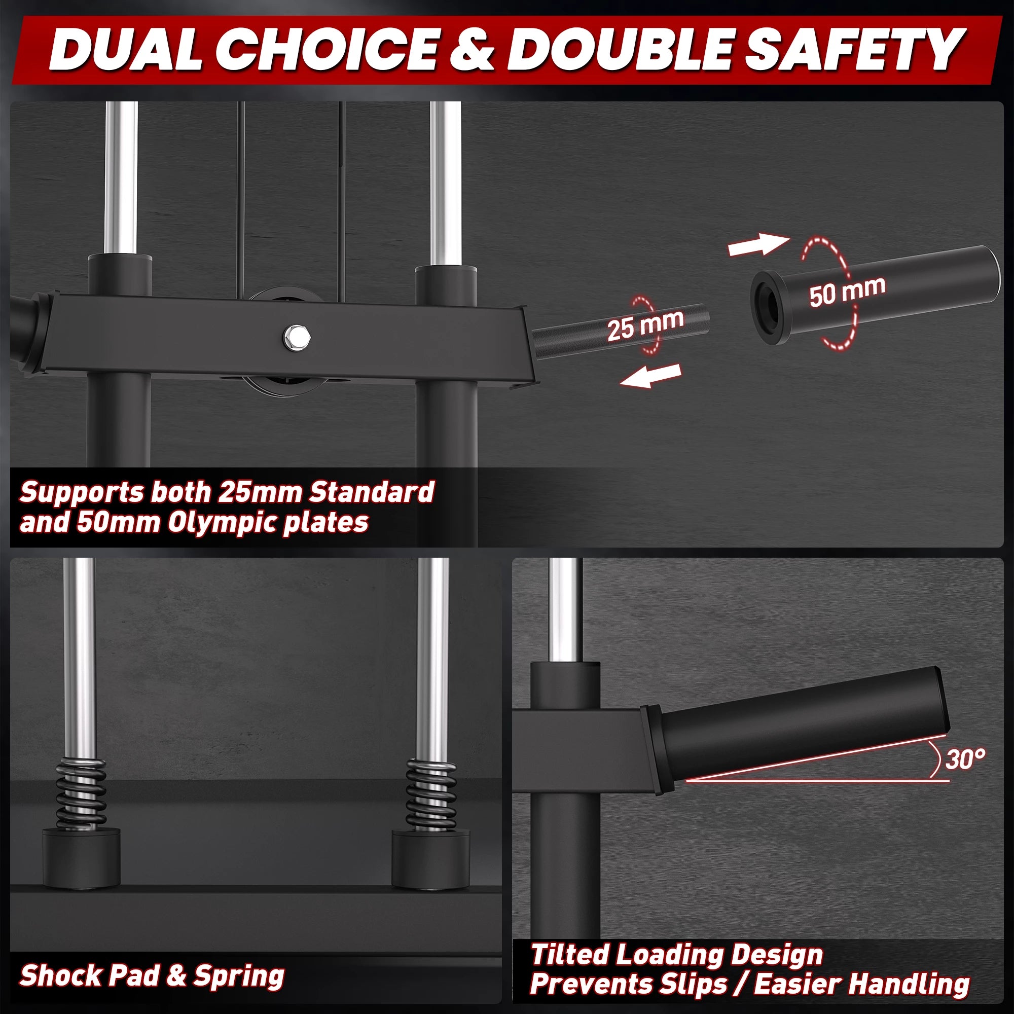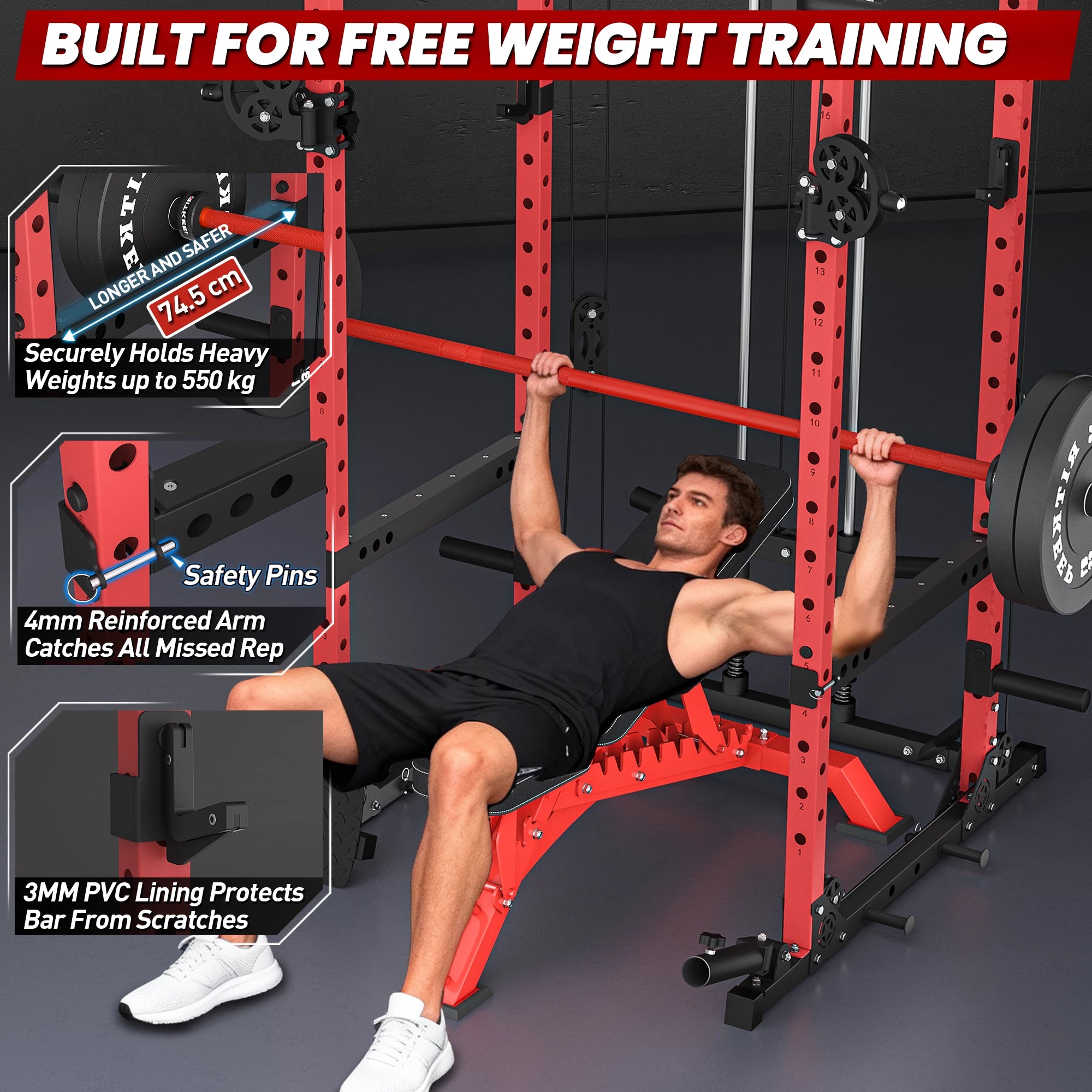 >> 15-LEVEL CROSSOVER CABLE SYSTEMSmooth 2:1 pulley ratio for functional, full-body training. Adjust through 15 height levels to target every angle with precision and control. >> VERSATILE MULTI-GRIP PULL-UP BARTrain back, arms, and core from multiple angles. Includes overhand, neutral, and underhand grips for advanced forearm and grip endurance. >> 16 x 1-INCH HOLE UPRIGHTSLaser-cut holes ensure fast and secure attachment setup. Compatible with all standard J-hooks, safety arms, and add-on accessories. >> PROFESSIONAL SAFETY ARMSRated for 550 KG, featuring a pin-lock system to catch your bar safely during failure—perfect for solo bench or squat sessions. >> 6 BAND PEGS FOR PROGRESSIVE RESISTANCEAdd resistance or assistance to any lift, improving explosiveness, control, and training variety. >>DESTROYER M10 POWER RACK ATTACHMENTSLat Pulldown Bar · T-Bar Row · Straight Bar · Landmine · Dip Bar · Band Pegs · Footboard · 4-Level Handle |