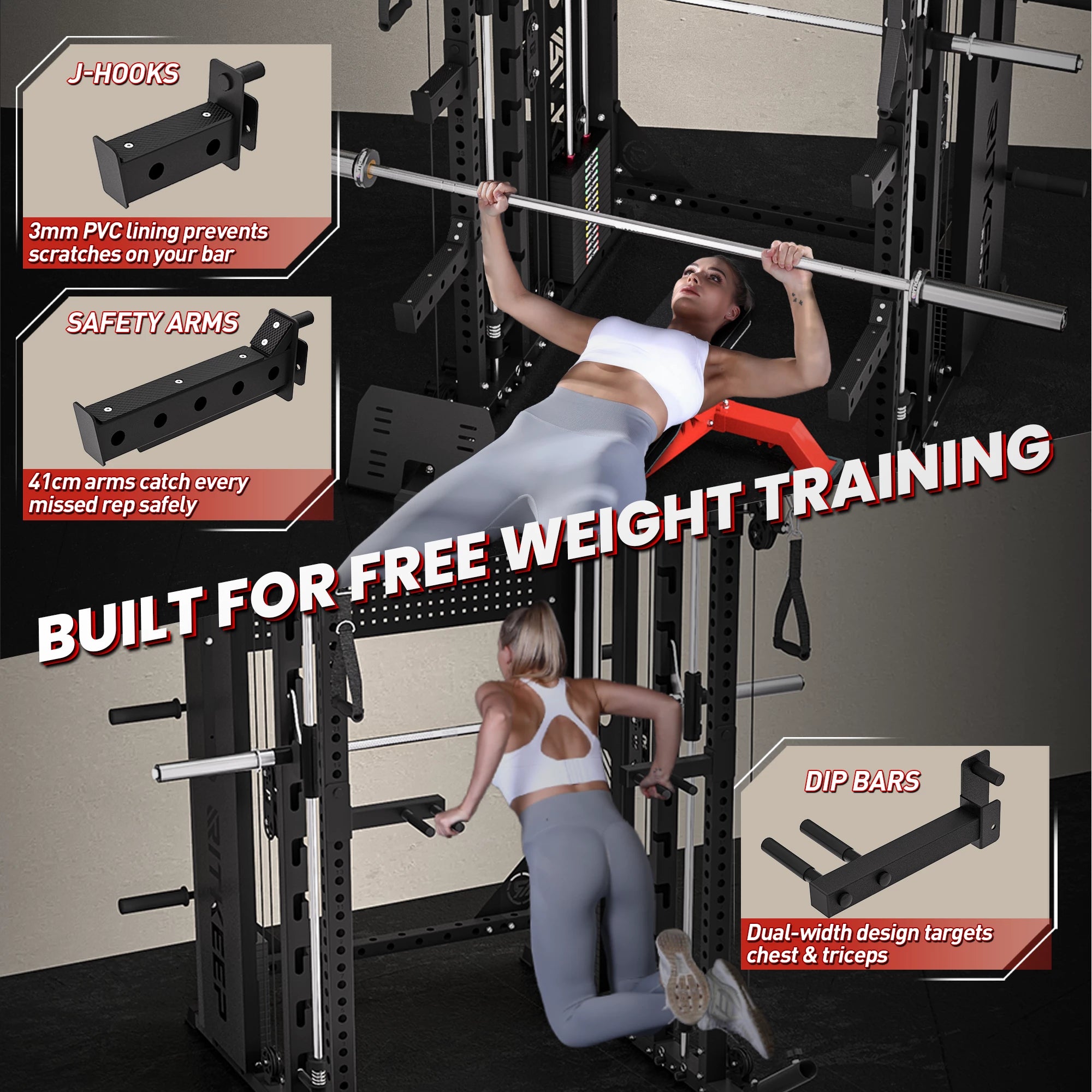 - J-Hooks & Safety Arms: Heavy-duty support for squats and presses—train safely without a spotter.