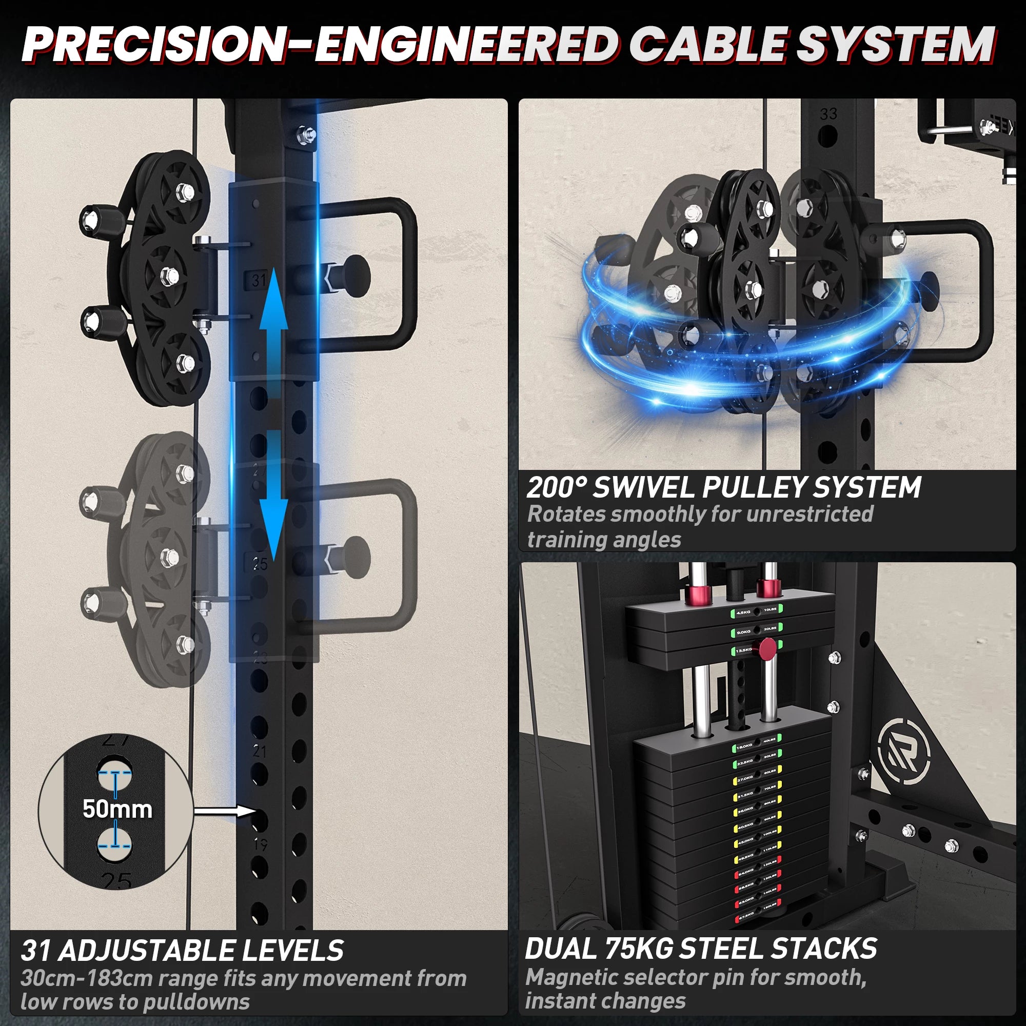 - Dual independent 75 KG precision steel weight stacks with magnetic selector pins for quick, accurate resistance changes.