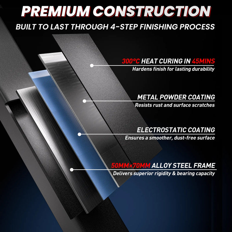 Built with 33 adjustment levels and precise 50 MM hole spacing, the frame delivers all the strength and versatility you need. The upgraded 13-gauge steel front uprights enhance overall stability and load capacity, allowing you to lift heavier with total confidence.