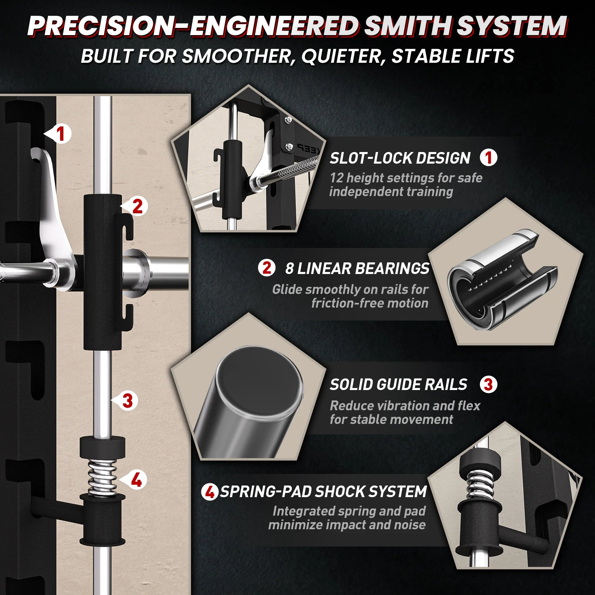 This design stores the Smith bar at its highest position within the frame, completely clearing your training area to maximize both your space and workout efficiency. Never duck around the bar again during pull-ups, dips, or free-weight exercises,